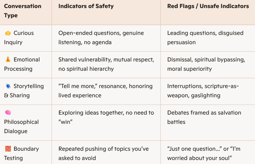 Boundary setting during religious deconstruction is a radical act of self-respect. It’s how you protect your emotional integrity while navigating relationships that may still be tethered to the system you’ve left. Defining what conversations are safe—and what aren’t—isn’t about shutting people out. It’s about creating space for truth without trauma.