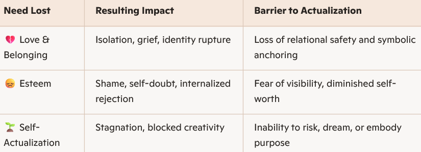With respect to Maslow’s Hierarchy, when the third tier of “love and belonging” disintegrates—whether through religious shunning, relational rupture, or cultural exile—it deeply fractures the psychological scaffolding that supports “esteem” and “self-actualization”.