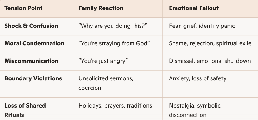 Families may interpret deconstruction as rebellion or moral failure. This can rupture intergenerational bonds, especially when religion is tightly woven into cultural or ethnic identity.