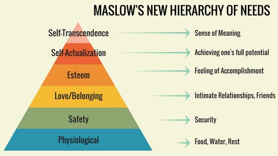 “Self-transcendence” is the forgotten summit of Maslow’s Hierarchy—a level he proposed late in life that goes beyond self-actualization. While self-actualization is about becoming the fullest version of yourself, self-transcendence is about moving past the self entirely to connect with something greater: others, nature, the cosmos, or a sense of the sacred. It’s seeking meaning beyond the self through pathways such as altruism, unity, and spiritual awakening.