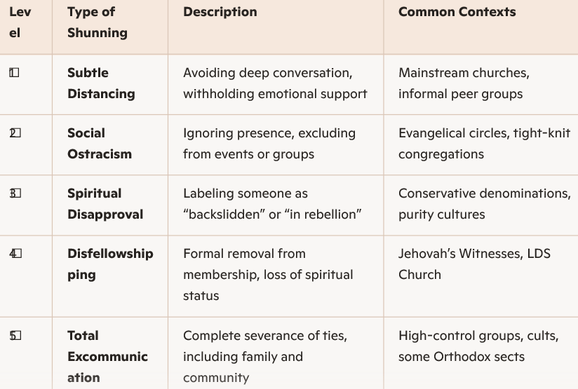 In some high-control religious environments, a person who leaves can become a target of shunning, which is a deliberate form of ostracism practiced by some religious communities to enforce conformity and punish dissent. Members are told not to speak or associate with the person. The person is erased from group communications. Guilt, shame, and fear are weaponized to isolate and silence.