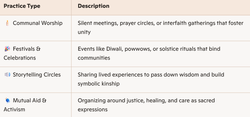 Collective Rituals: From Quaker silent meetings to indigenous powwows, social spirituality transforms group interaction into sacred practice.