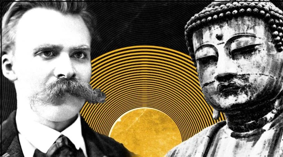 If Buddha and Nietzsche sat down together, they wouldn’t argue about gods or doctrines. They would talk about the human condition—about suffering, illusion, freedom, and the courage it takes to live without borrowed meaning.